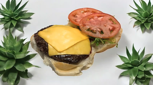 8 Oz of 100 % Beef patty with American Cheese, lettuce, tomatoes, onions, mayo.